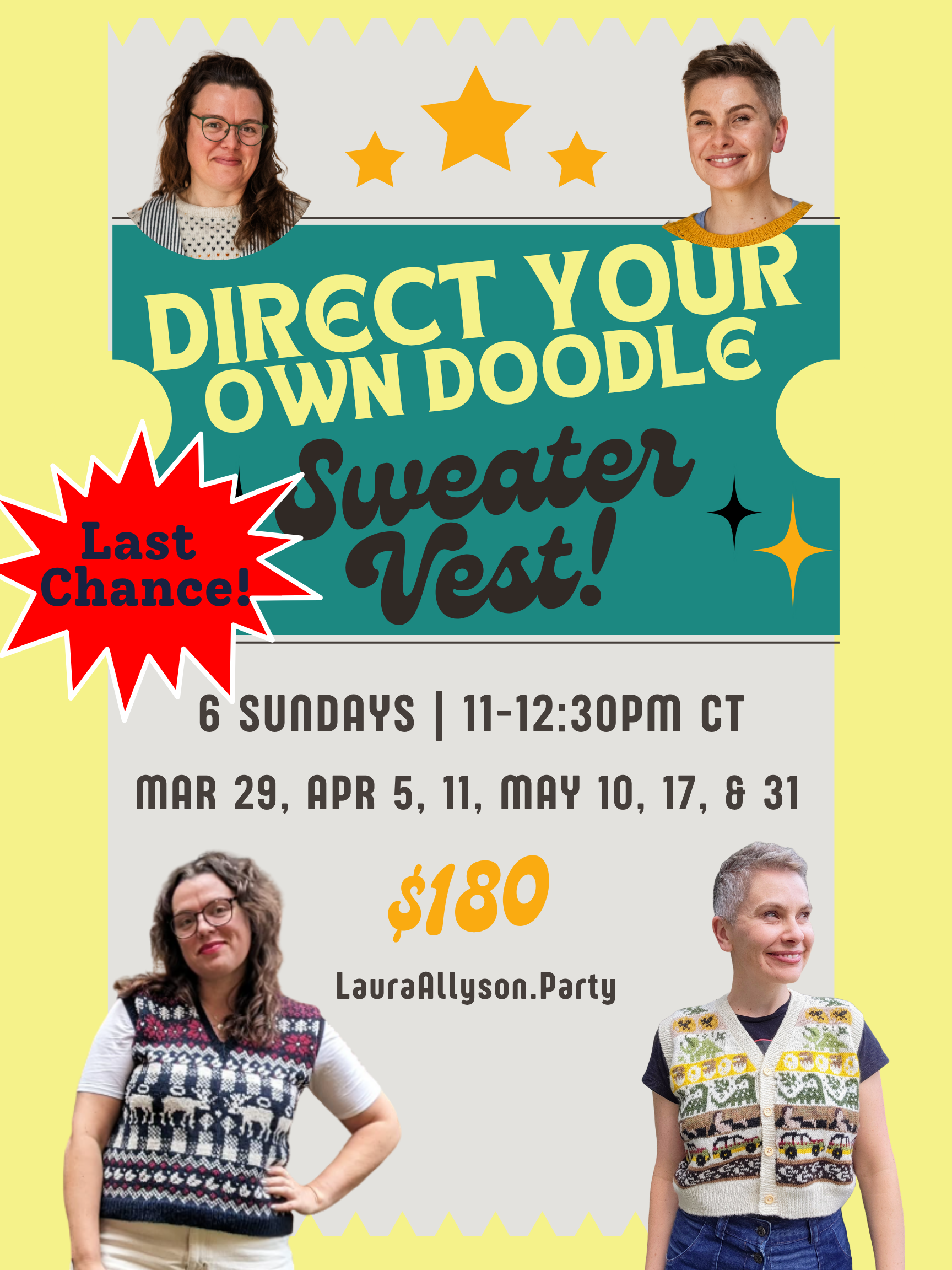 Registration closes TODAY for Direct Your Own Sweater Vest Class that Laura and I are teaching because it starts on Sunday!