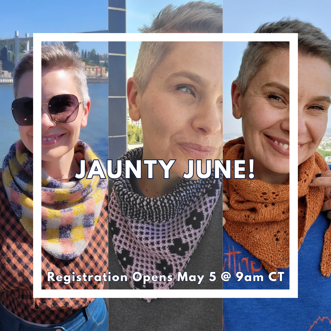 This means that I’m done knitting and prepping for my 3 jaunty little kerchiefs I’ll be teaching for Jaunty June! Registration opens wide on Tuesday, May 5th at 9am CT. LauraAllyson.Party people will have early registration access on Monday, May 4th at 9am CT. It feels like these will be popular so it’s probably a good time to be a party person!