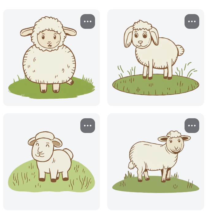 So I just use Canva to make these and usually I dig through the premade art and elements, and that’s where I found these cute sheep. Sometimes though I dig around and play with the Canva AI to see what I can create! I had an idea to make a knitting sheep scene, but I asked AI to create “Happy, adorable sheep in a green field” and it made these: