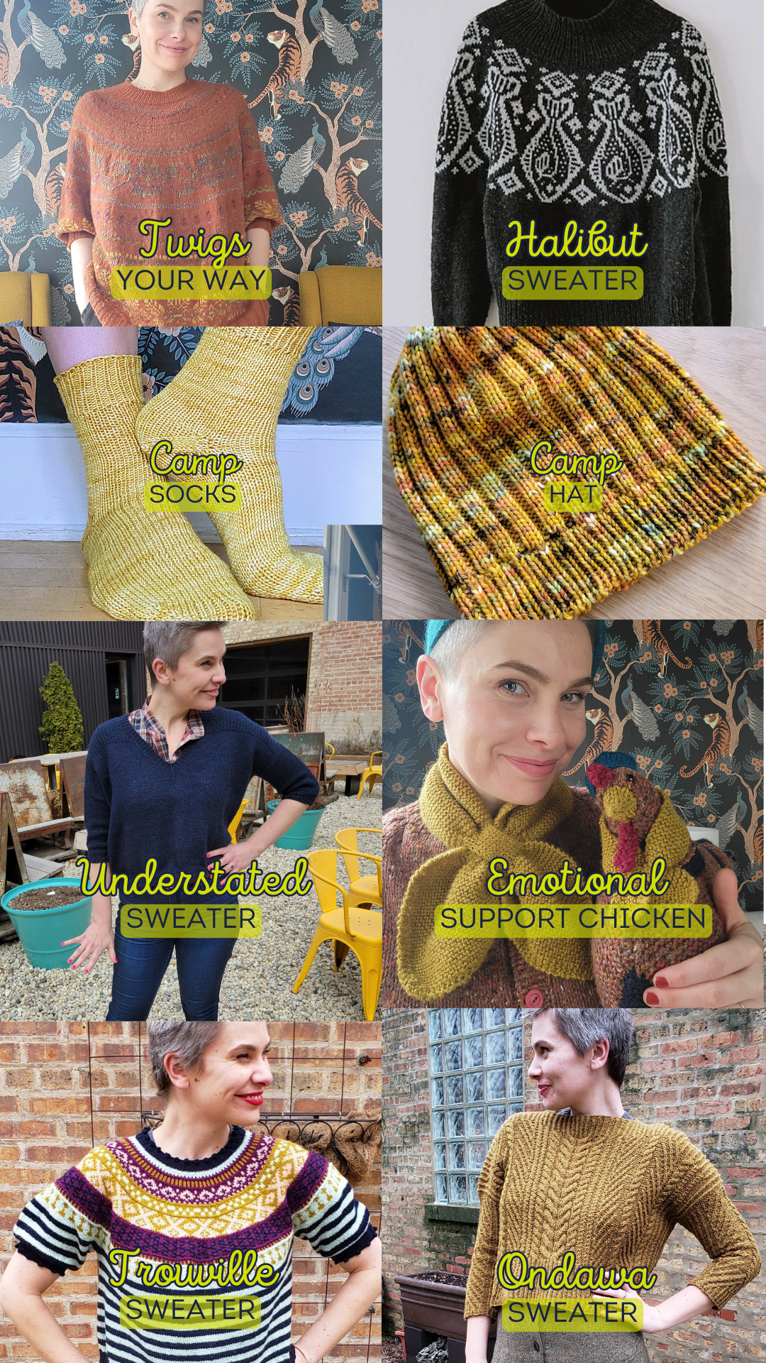 Camp Socks, Emotional Support Chicken, Halibut Sweater, Twigs Your Way, Camp Hat, Understated, Trouville, and now Ondawa!